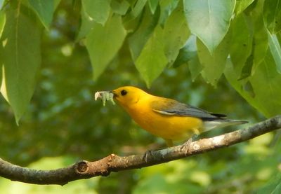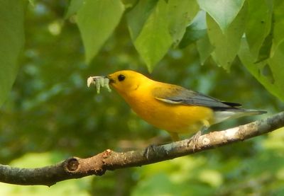 The nestlings grow incredibly fast. They fledge leave the nest when they are only 10-11 days old. For the nestlings to grow so fast, both male and female Prothonotary Warblers must feed the nestlings high protein food constantly. Food includes butterflies, moths, flies, beetles, spiders, caterpillars, and assorted larvae. About a month and a half after fledging, young Prothonotary Warblers closely resemble adults. At that time they will also begin some pre-migratory dispersal. By late August the majority of young and adult Prothonotary Warblers will have left the area to begin migration to their winter grounds.
