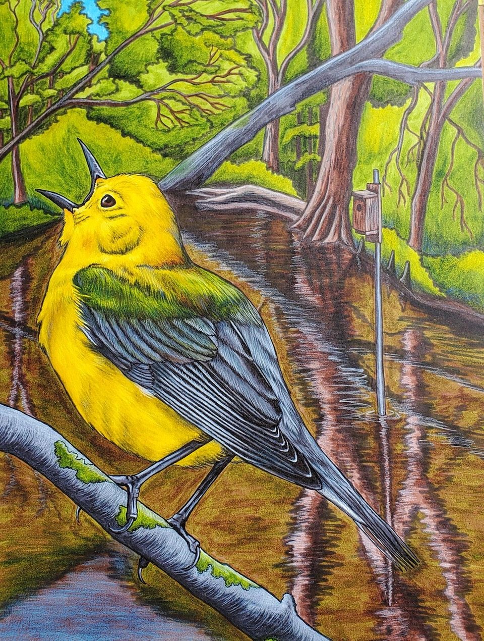 Why are we studying Prothonotary Warblers? These yellow gems of the swamp are most vulnerable to destruction of their habitat, both in North America and in Central and South America. Partners in Flight has placed the Prothonotary Warbler on its US/Canada Watch List. Local, volunteer-based nest-box programs for the species are becoming more common in regional and county parks to repopulate areas where populations have dwindled or disappeared.